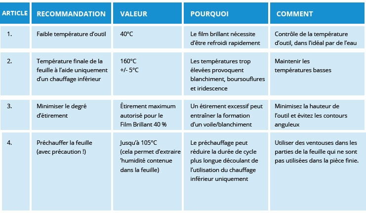 Le formage de ces matériaux est le plus efficace avec un outillage en aluminium de bonne qualité et bien fini qui incorpore un contrôle thermique.